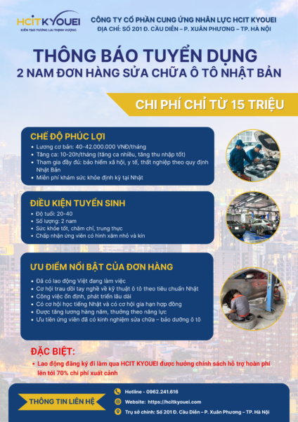 Đơn hàng sửa chữa ô tô Nhật Bản đang phát triển mạnh, nhu cầu tuyển dụng thợ sửa chữa ngày càng tăng. Đây là công việc phù hợp cho những bạn đam mê cơ khí – kỹ thuật, muốn phát triển tay nghề trong môi trường hiện đại, kỷ luật và chuyên nghiệp.