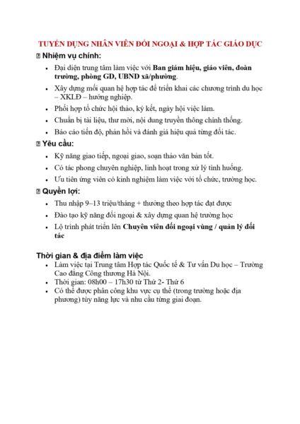 • Vị trí: Nhân viên Đối ngoại & Hợp tác Giáo dục