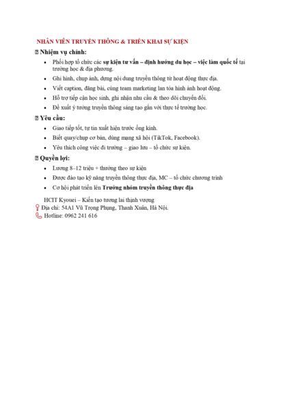 - Vị trí: Nhân viên Truyền thông & Triển khai sự kiện