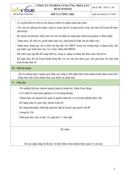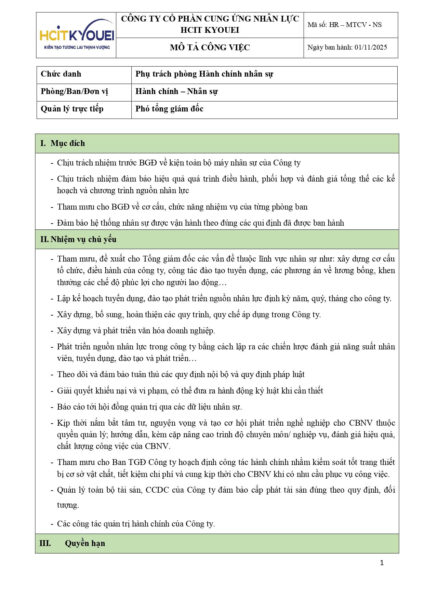 • Chức danh: Phụ trách Phòng Hành chính – Nhân sự